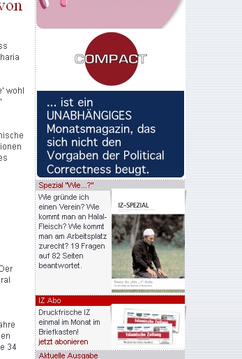Das soll aber nicht mein Thema sein. Mir geht es um Srebrenica. Fakt ist, dass der Herausgeber der Islamischen Zeitung, Andreas Abu Bakr Rieger, regelmäßig (allerdings ohne Abu Bakr) in der COMPACT schreibt. Es gibt sehr enge publizistische Beziehungen zwischen beiden Zeitungen und ihren Herausgebern und Chefredakteuren, denn Herr Rieger schreibt nicht nur für das COMPACT-Magazin, sondern er gilt auch als Mitbegründer und ist finanziell als Gesellschafter beteiligt. Die Islamische Zeitung macht auf ihrer Internetpräsenz (rechte Menüleiste) sogar Werbung für das Magazin von Jürgen Elsässer (siehe Bild links).