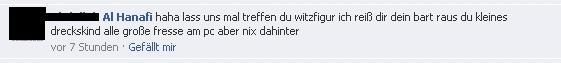 Und zu guter Letzt möchte ich noch auf seinen Vorwurf eingehen, nur „Internet-Salafis“ würden sich einer solch fehlerhaften oder auch flegelhaften Sprache befleissigen. Ich bin nun schon seit einiger Zeit – und zum Teil auch zu meinem Leidwesen – auf Facebook aktiv und wurde seither von zahlreichen Nichtsalafis in Dialoge verwickelt, die nicht selten dahingehend endeten, dass der Gegenüber ein Verlangen danach entwickelete meine Mutter zu f***en und häufig mich gleich mit dazu.